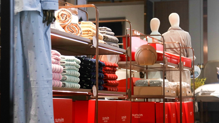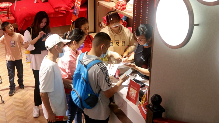 到店有禮,人流如織,邁入孚日家紡店門,一片片中國紅映入眼簾,一組組婚慶家紡琳瑯滿目,顧客瞬間沐浴在一片濃情化不開的喜慶氛圍之中。